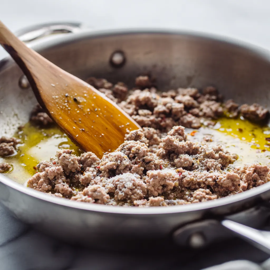 Heat olive oil in a large pot over medium-high heat. Add the ground beef and cook until browned, breaking it apart with a wooden spoon. Season lightly with salt and pepper.