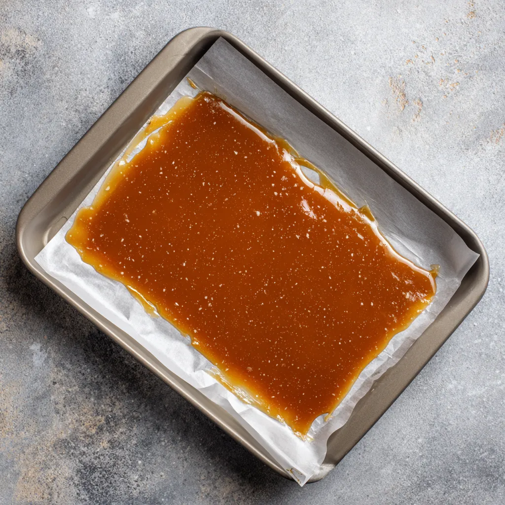 Pour the melted chocolate over the caramel layer. Use a spatula to gently spread it across the entire surface.