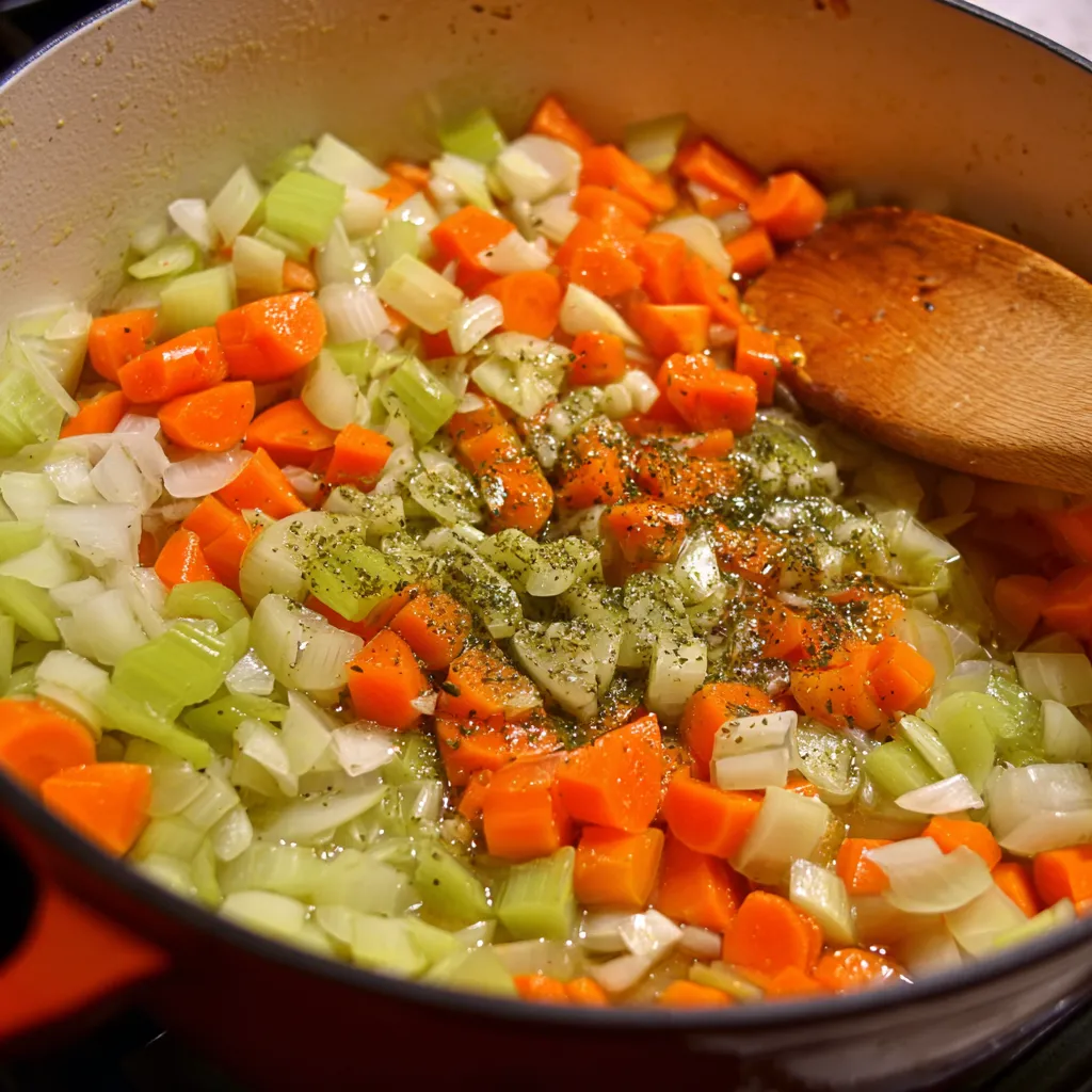 Heat olive oil in a large pot over medium heat. Add the onions, carrots, and celery. Stir and cook until softened about 5 minutes. Add garlic and cook until fragrant.