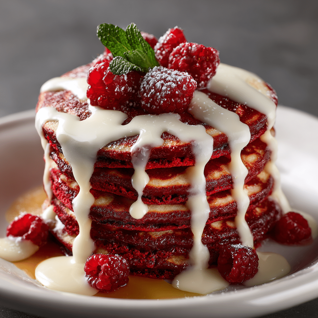 I serve red velvet pancakes with cream cheese glaze family-style, stacked high on a big plate. Sometimes I add fresh strawberries or raspberries for contrast. Other mornings, I keep it simple with just glaze and powdered sugar.