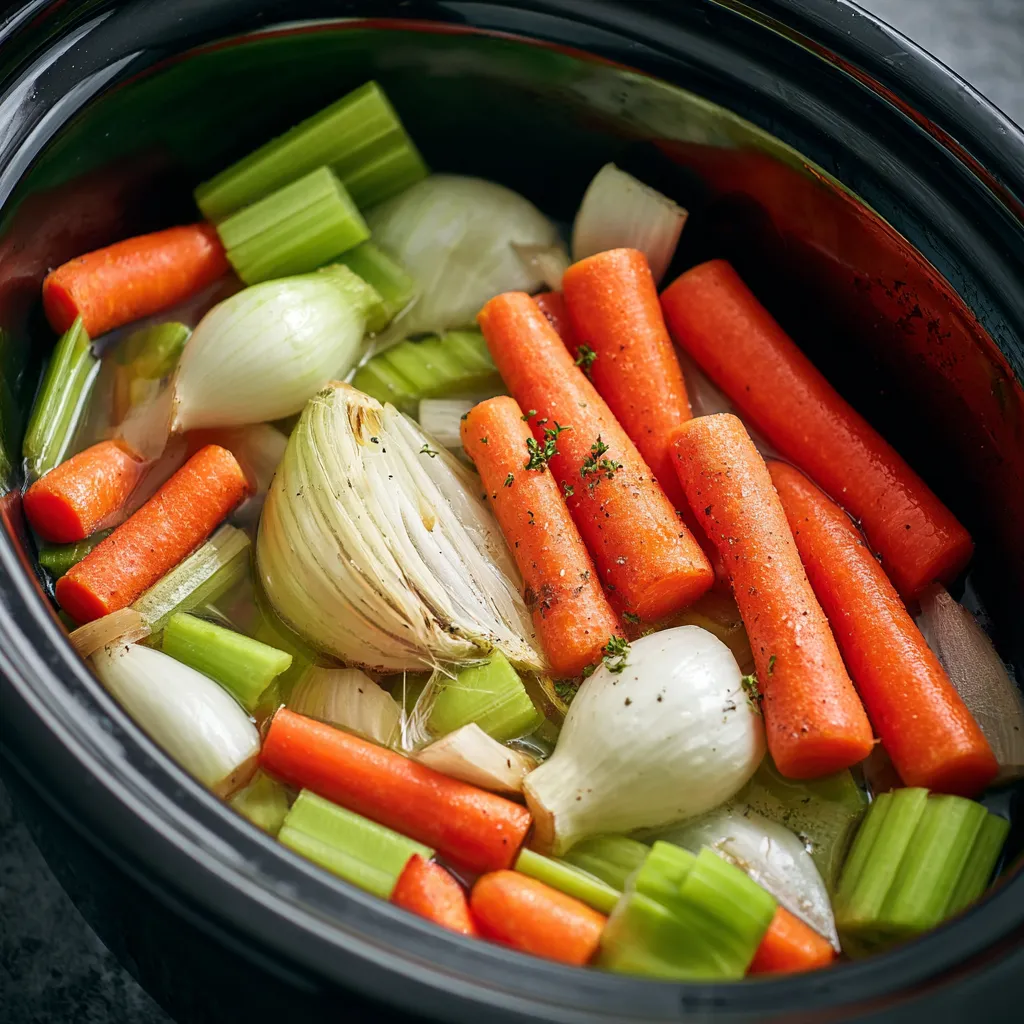 Add the carrots, celery, onion, and garlic to the bottom of your slow cooker. These vegetables form the aromatic foundation of your soup.