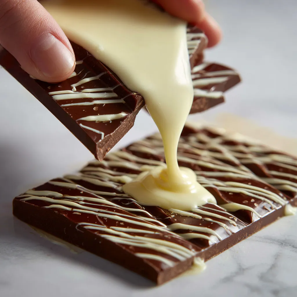Repeat the melting process with the white chocolate. Drizzle it over the semi-sweet chocolate in zigzag patterns.