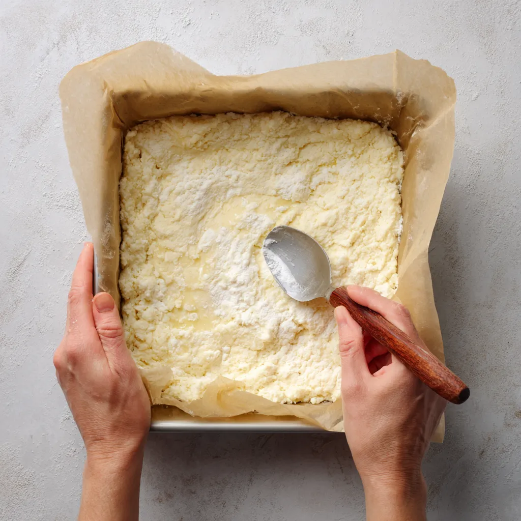 Press the dough into a parchment-lined 8×8 baking pan. Smooth the top with your hands or the back of a spoon.